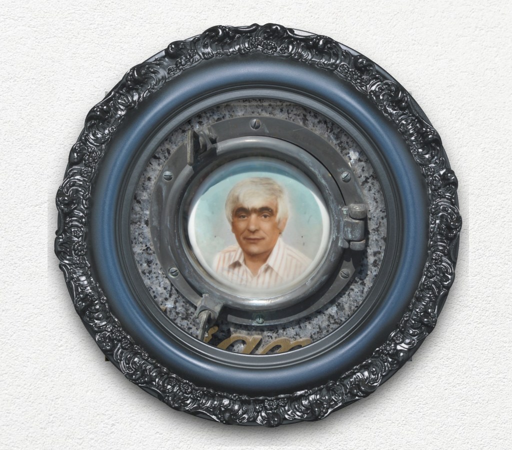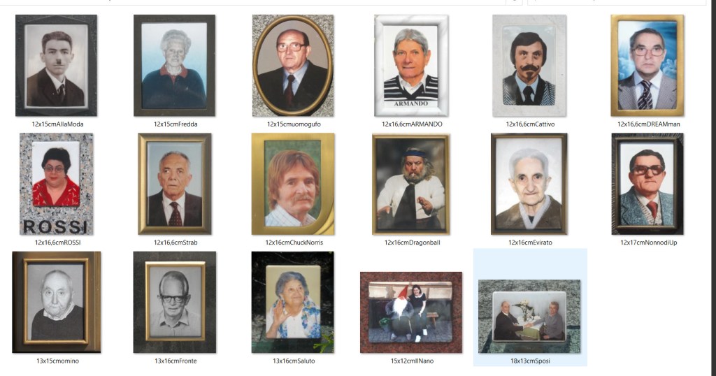 Un Saluto dall’oltretomba è un’opera di fotografia concettuale che raggruppa una serie di fotoceramiche “buffe” trovate nei cimiteri di Milano e del circondario – nel tentativo di cogliere nella risata un modo diverso di sublimare il lutto o il reverendo timore verso la bolla sacra della morte. Le icone incorniciate, o meglio, i personaggi che nei loro tratti più assurdi assumono delle caratteristiche universali e riconoscibili, partecipano propriamente questo passaggio di stato: dalla marcescenza del corpo al regno senza tempo dell’immaginario.