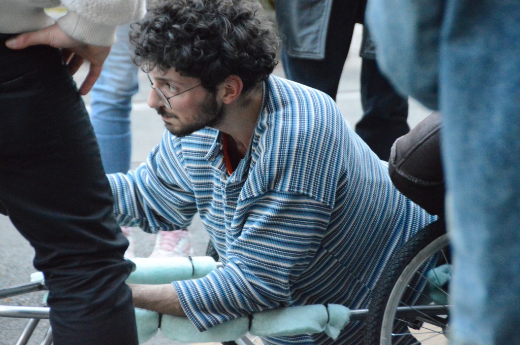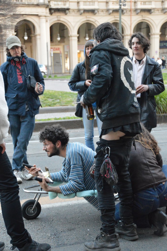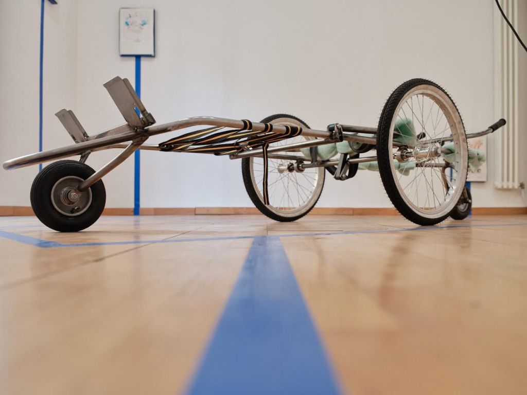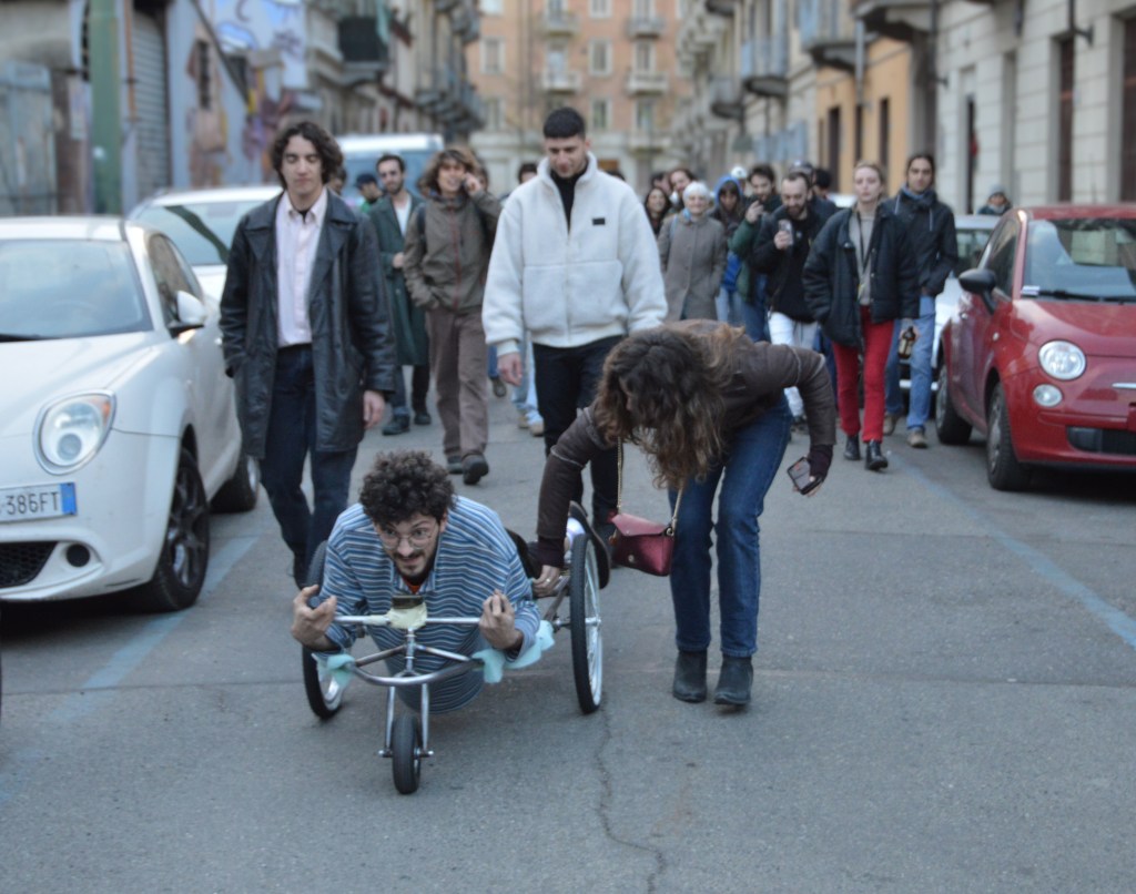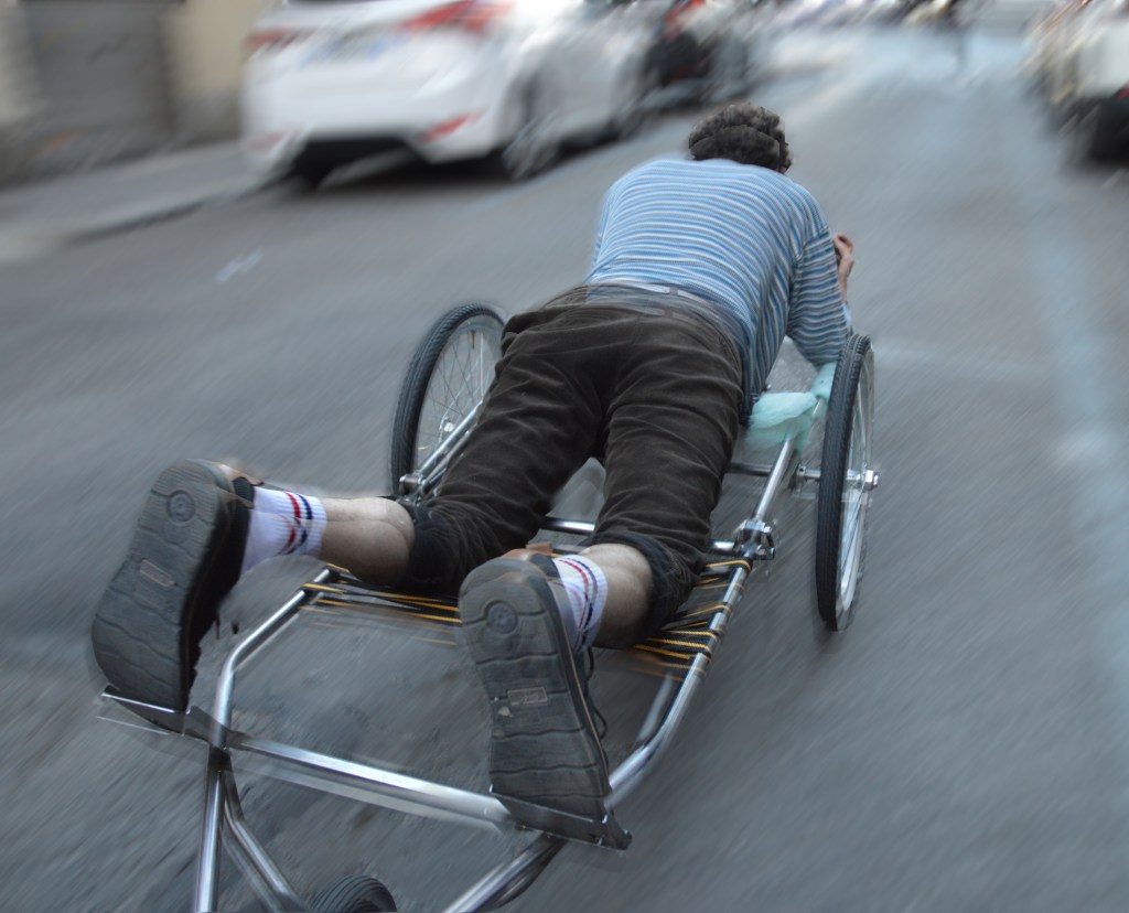 Pacifista, ecologica, e anti-umana, dispositivo per mobilità orizzontale™ è la prima macchina celibe pensata per tradurre la postura di dominio dello stare in piedi alla postura generativa del giacere distesi. Ispirandosi da un lato agli attrezzi ginnici a cielo aperto destinati alla età geriatrica, e dall’altro, a certi rituali aborigeni destinati alla felicità dell’agricoltura, dispositivo per mobilità orizzontale™ vuole educare lo sguardo, ma anche l’intera massa muscolare, ad un rapporto ravvicinato con la Terra. O per essere più precisi, alla visione traumatica e inaspettata della sua pelle d’asfalto.